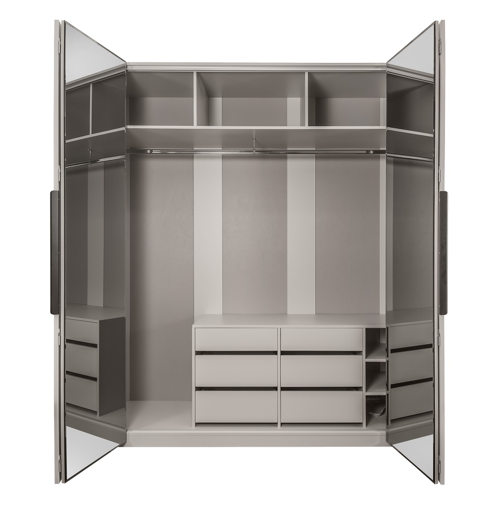 Завершают коллекцию вместительные шкафы "Стелла" которые представлены в 2х размерах — 4х и 6ти дверный. Складной механизм фасадов экономит место, плавная эргономичная форма ручки рейлинга позволяет удобно пользоваться шкафом, стандартное внутреннее наполнение с 2мя функциональными комодами, полками и штангой сохранят ваши вещи в порядке .