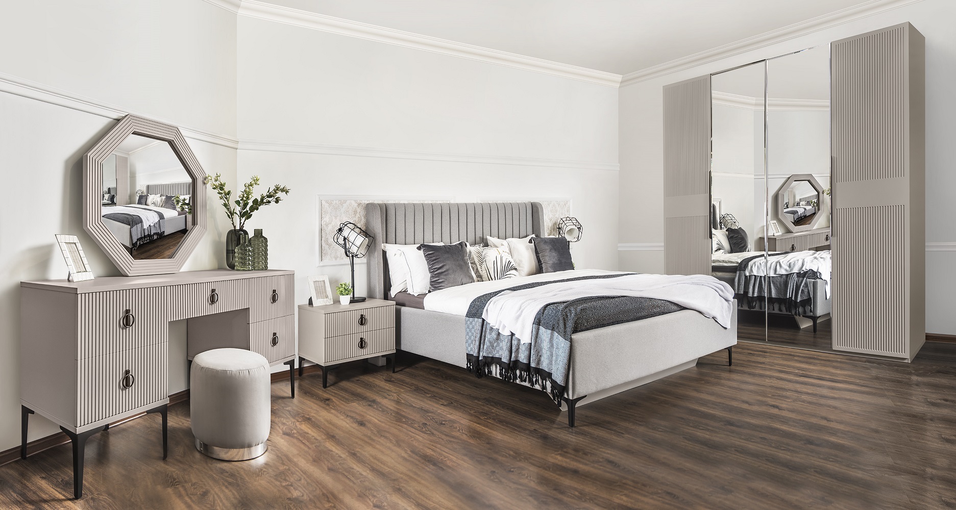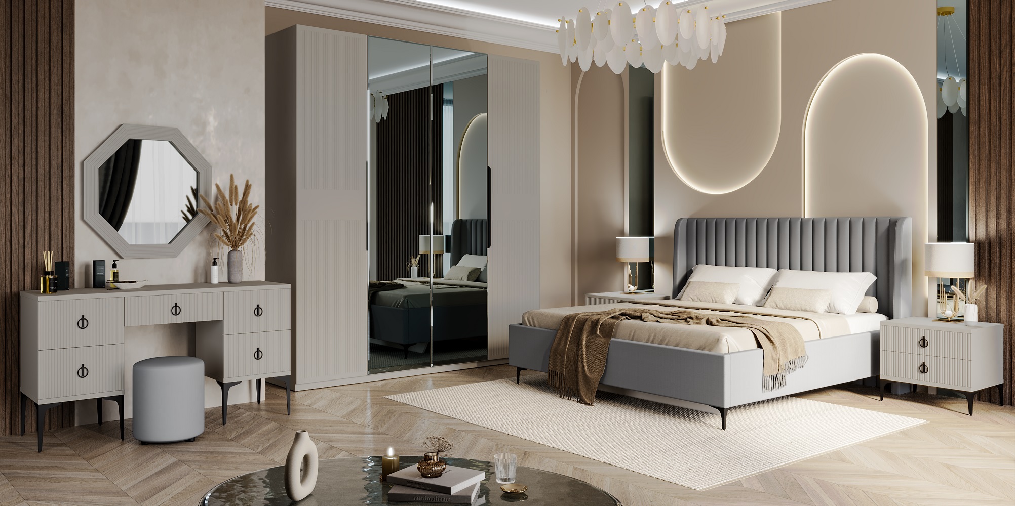 Каждая деталь спальни тщательно продумана, чтобы подарить вам не только максимальный комфорт и эстетическое удовольствие, но и уверенность в высоком качестве мебели. Корпуса и столешницы модулей выполнены из ламинированной древесной плиты европейского качества, Фасады из природного МДФ задекорированы рельефной фрезеровкой и авторский стиль фабрики ЭРА — это финишное покрытие матовая итальянская эмаль ярко серого цвета.