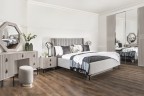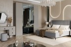 Доминантой интерьера спальни является мягкая кровать Стелла Оригинальная простежка и строгий лаконичный силуэт поддерживают общую стилистику, а форма изголовья с изогнутыми краями образуют уютное пространство для спокойного и крепкого сна